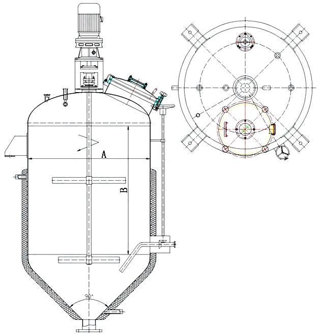 主要由附夾套的橢圓封頭、錐底形的筒體、內(nèi)裝三葉式攪拌以及特殊的微調(diào)旋出液管等組裝而成。